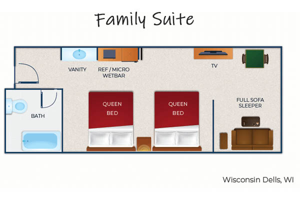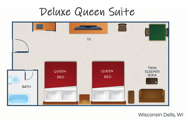 One of the more popular suite options at the Great Wolf Lodge Wisconsin Dells is the Deluxe Queen Suite. A more affordable option, the Deluxe Queen Suite sleeps 5 guests comfortably with two (2) queen beds and a twin sleeper sofa. The balcony adds to the excitement of the design of this room.