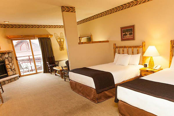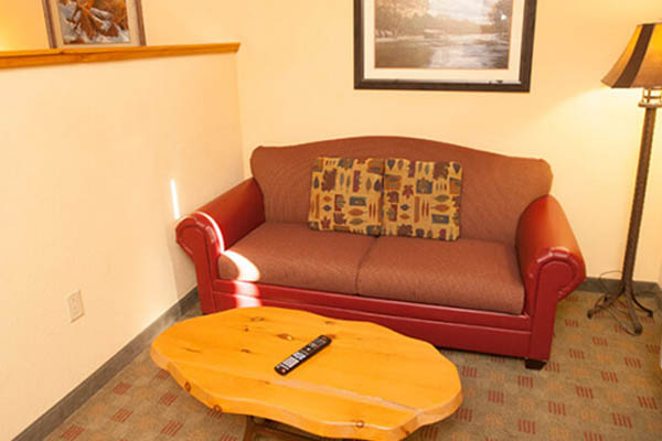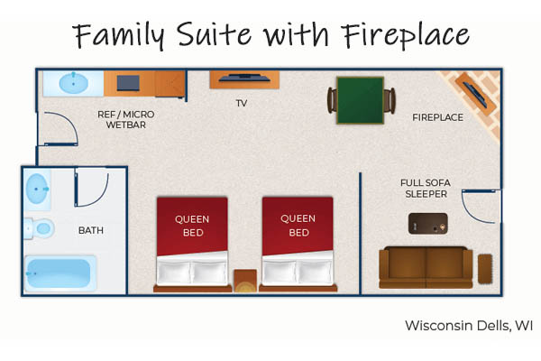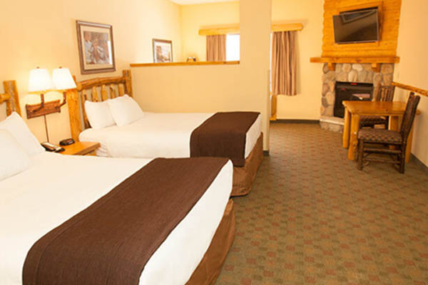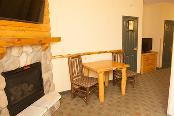 The Family Suite with Fireplace sleeps up to 6 total guests. The Family Suite with Fireplace is identical to the Family Suite but has a stone fireplace in the corner of the living area.