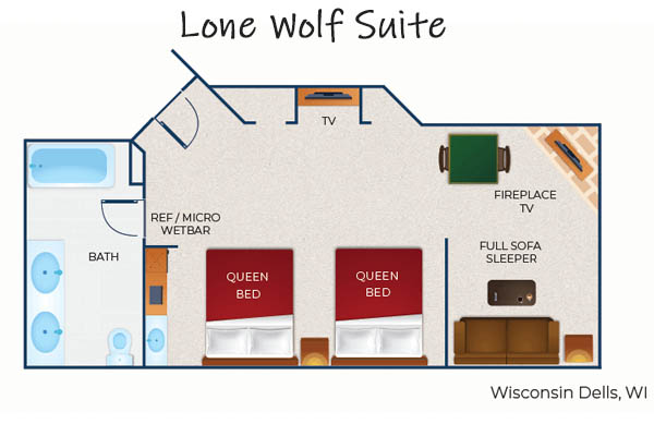 The Lone Wolf Fireplace Suite h Fireplace sleeps up to 6 total guests. The biggest difference between the Lone Wolf Suite and the Family Fireplace Suite is the Lone Wolf Suite has additional square footage and a much larger bathroom area.