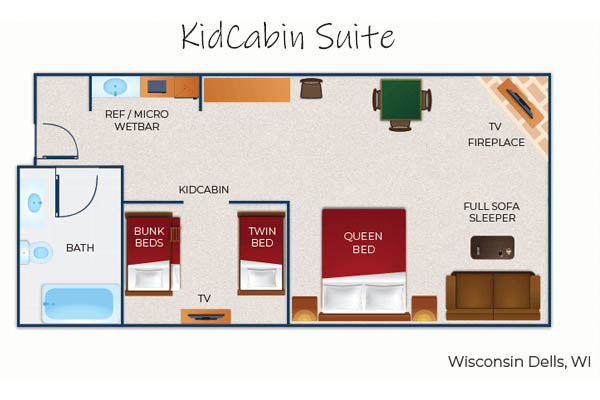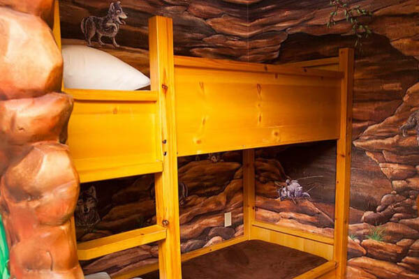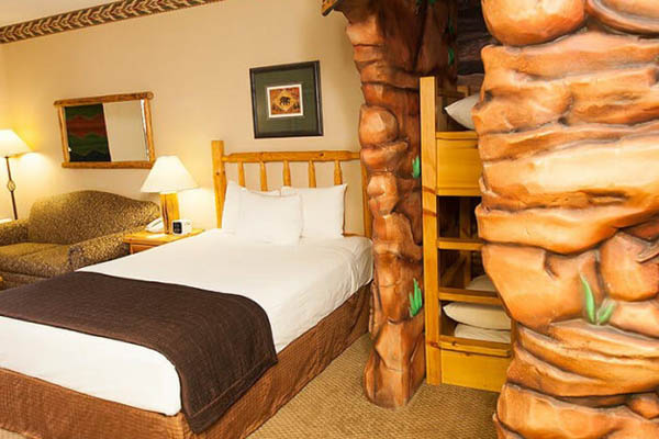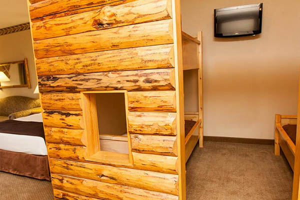 Kids love the KidCabin Suite at the Great Wolf Lodge Wisconsin Dells. Inside of the main room, a separate log cabin room was created with a bunk bed on one side and a twin bed on the other. Kids love to have their own space. Parent like having some time on their own as well.