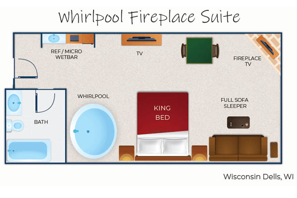 Snuggle up to the cozy fire while sitting in your living space in the Whirlpool Fireplace Suite at the Great Wolf Lodge in Wisconsin Dells. The addition of an in-room Jacuzzi makes this suite a perfect getaway for two but sleeps up to four with the sleeper sofa.