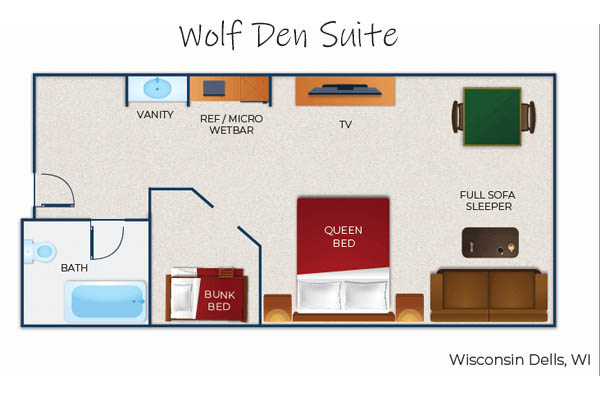 Kid's love the Wolf Den Suite at the Great Wolf Lodge Wisconsin Dells. The Wolf Den Suite has a Queen Bed, Sleeper sofa and an enclosed area for the kids with bunk beds. What could be more fun?